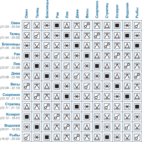 Как мы видим, знаки предполагают семь основных видов взаимоотношений, из которых благоприятными или совместимыми оказываются лишь два вида, еще один вид считается нейтральным, а четыре оставшихся - неблагоприятными или несовместимыми. Вероятность удачи невелика, что и говорить! Чаще всего астрологи называют благоприятными два первых типа отношений, не рекомендуя типы с третьего по шестой.