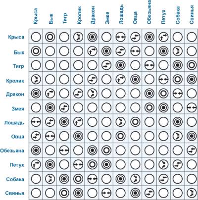 Потенциал - данный аспект в таблице не показан, хотя присутствует в каждом типе отношений. Соответствует потенциальным возможностям индивидуума самостоятельно вершить свою судьбу. Поскольку китайские астрологические знаки основываются на годе рождения, а западная астрологическая традиция зиждется на месяце рождения, сочетание этих двух систем позволяет прийти к довольно интересным результатам.